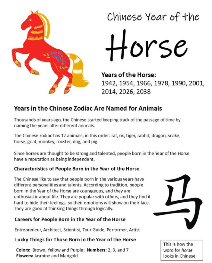 5. Year of the horse information sheet Chinese zodiac horse Chinese horoscope Chinese zodiac year Chinese astrology Chinese year The chinese zodiac