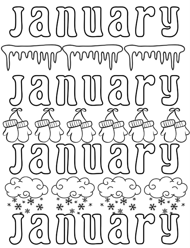 6. Printable January Word Art with Mittens and Snowflakes Image to Color